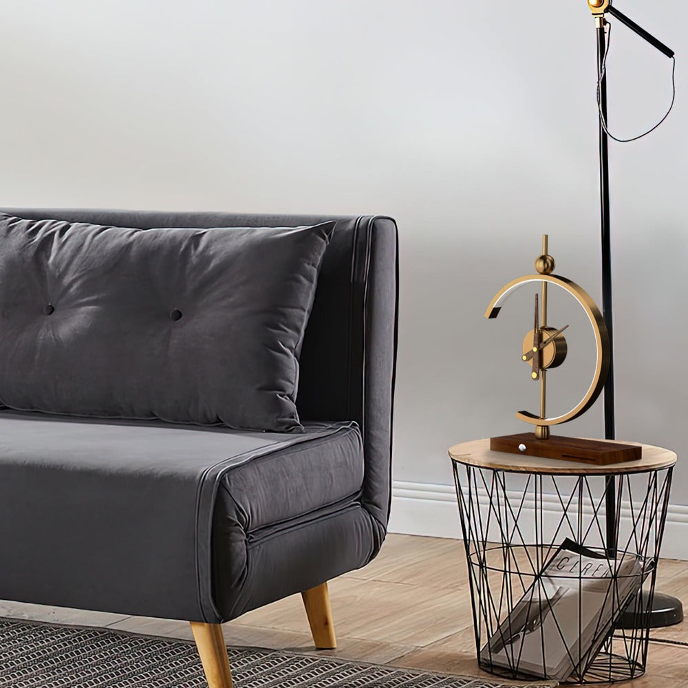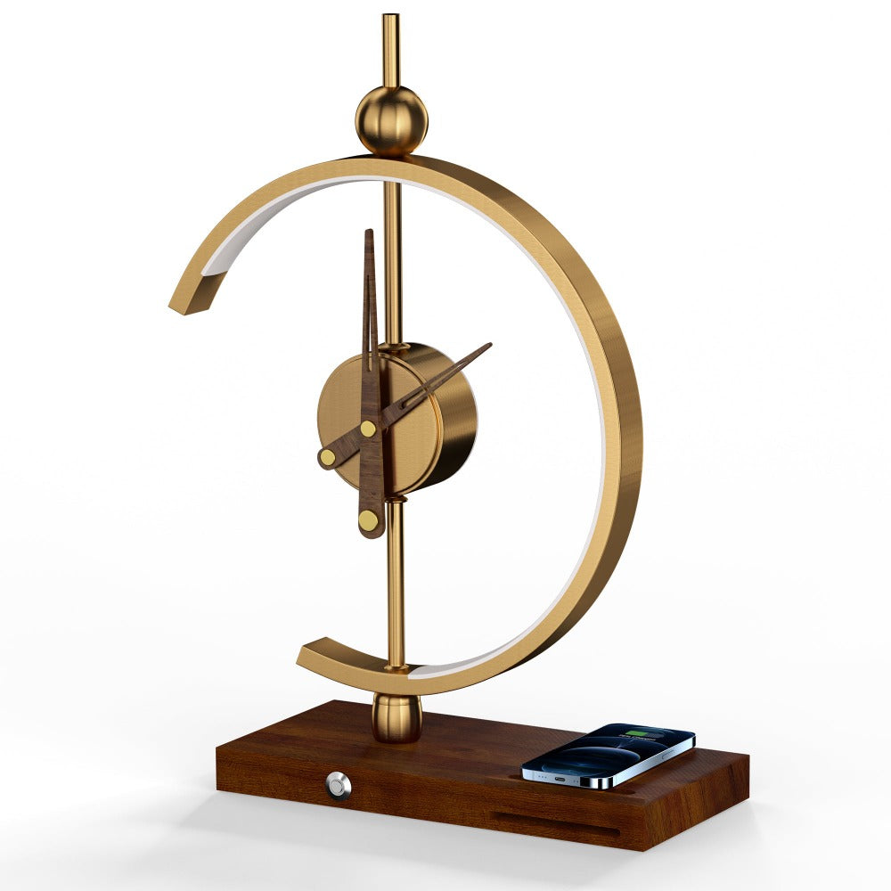 Elegant, modern, and multifunctional, this Clock Lamp is an eloquent centerpiece for your living room. A curved LED light gently accents the minimalistic design of the clock, while the combination of oak and gold plating lends it a classic appeal. The stunning oak base also doubles up as a wireless phone charger and also features a smooth touch button to adjust the lamp's brightness.