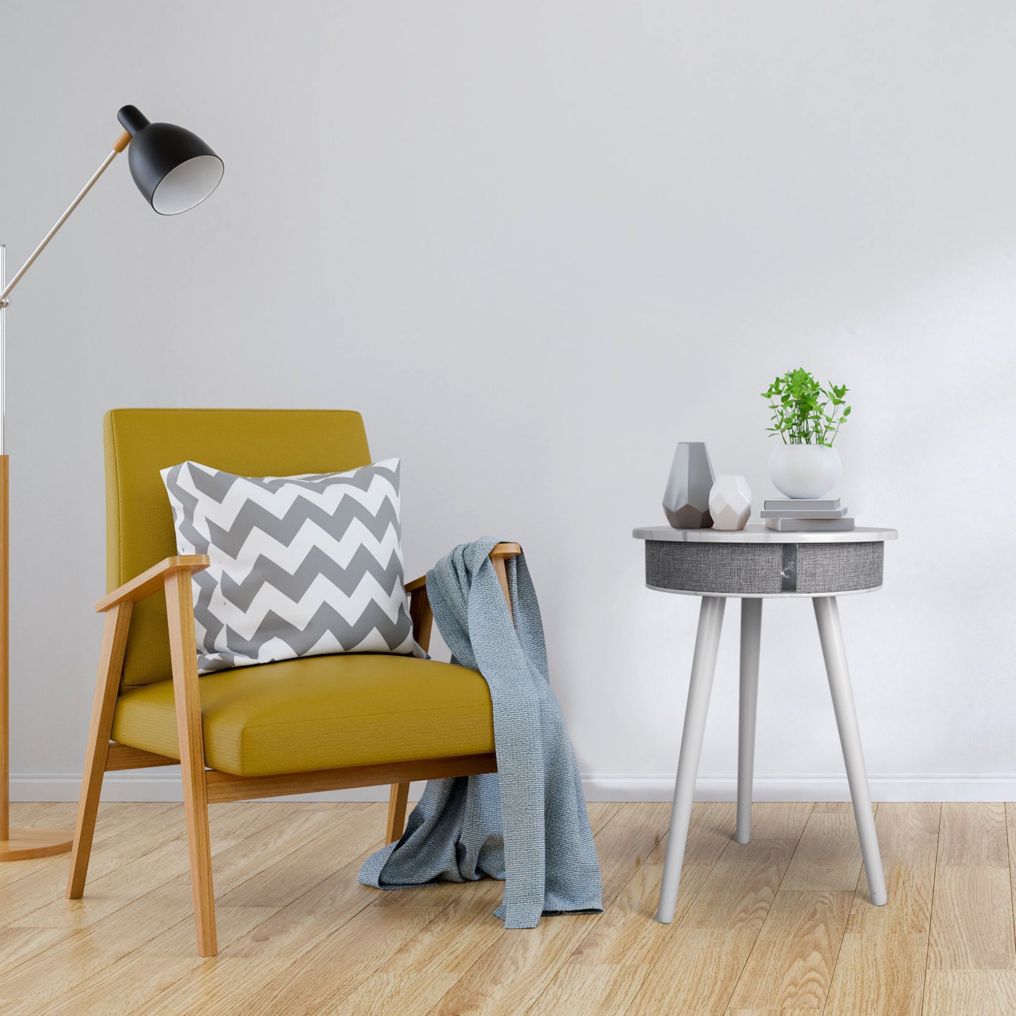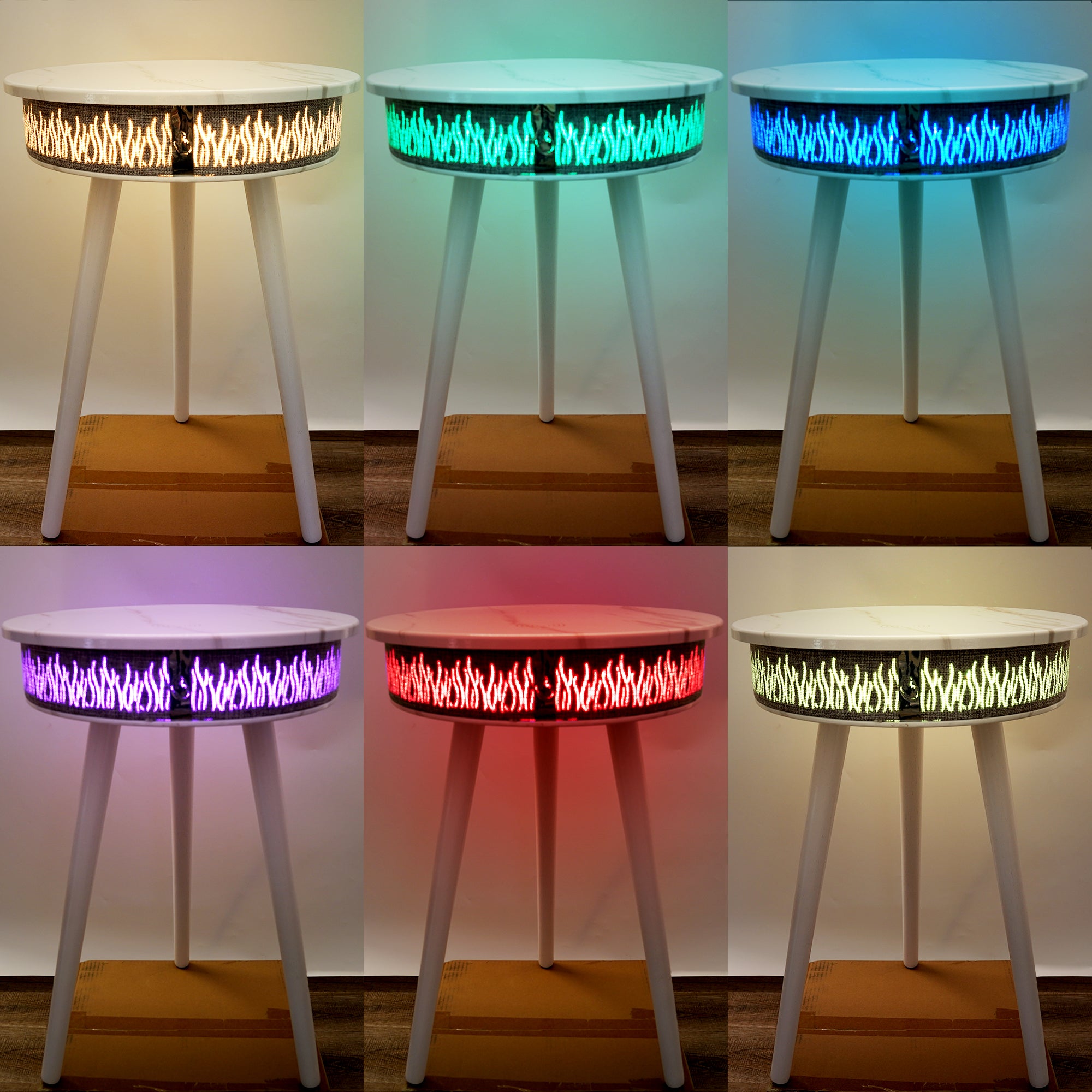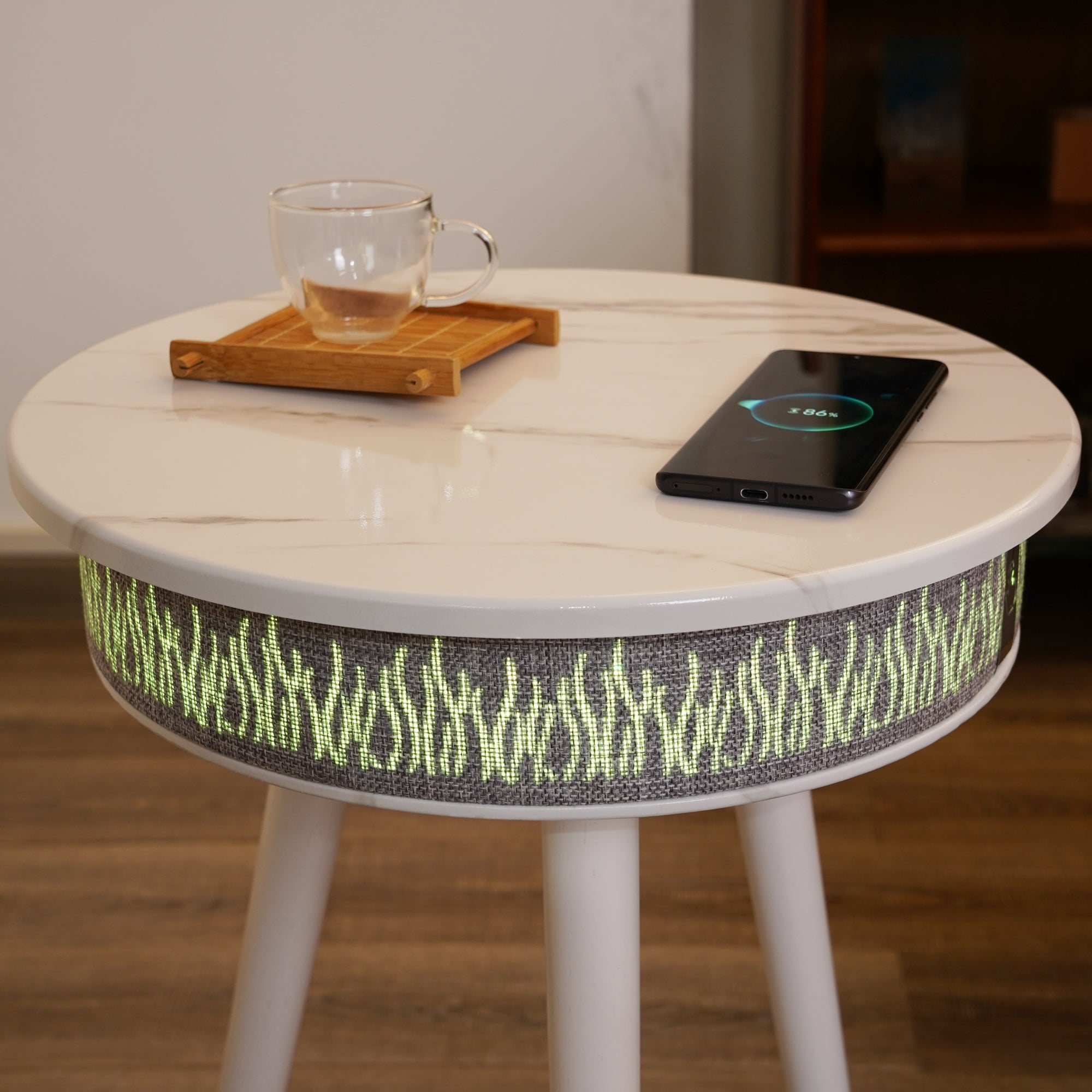 Sleek and sophisticated, this technology-enhanced Bluetooth Speaker Table gives any space an instant upgrade. It does more than hold your cup of coffee—it features 10W stereo speakers, music-reactive RGB lighting, and a complete charging station to keep all your devices fully powered. Connect your phone wirelessly via Bluetooth to enjoy your favorite music and podcasts with exceptional clarity. When your phone is low on power, you can plug it into the fast-charging USB ports or place it on the 10W wireless charging spot to start charging instantly. This modern table is super lightweight so you can move it from room to room when you want to, and powered by a long-lasting rechargeable battery to provide hours of completely wire-free music and power.